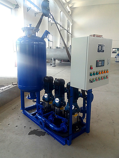定壓補(bǔ)水裝置是由定壓?jiǎn)卧统好摎馀蛎浌迌纱蟛糠纸M成,機(jī)組運(yùn)行時(shí),系統(tǒng)是通過(guò)定壓?jiǎn)卧獊?lái)實(shí)現(xiàn)低壓自動(dòng)補(bǔ)水、超壓自動(dòng)溢流,保證系統(tǒng)定壓,系統(tǒng)在排氣過(guò)程中,是將高壓帶氣泡的水通過(guò)常壓脫氣膨脹罐進(jìn)行常壓脫氣,析除循環(huán)水中的氣體。